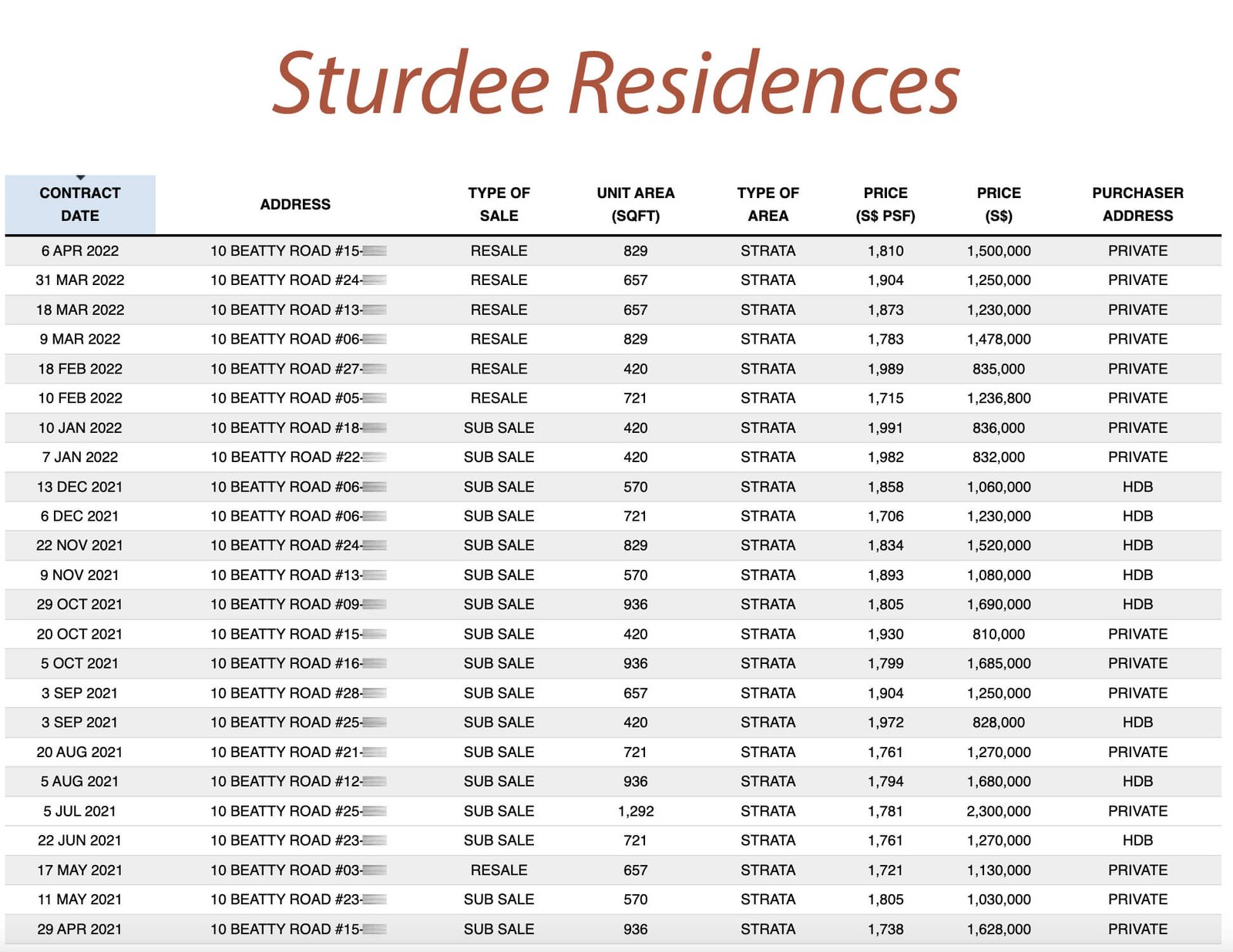 You can see most of the transactions that occurred over the last 1 year (from April 2021 to April 2022) are mostly either the smaller-sized units or units that cost less than $2 million.
